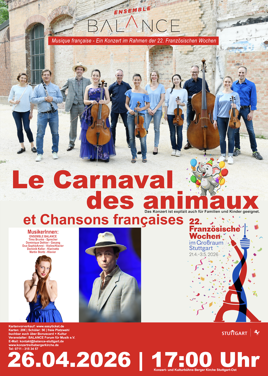 So vielseitig wie Frankreich selbst, ist auch Camille Saint-Saëns „Karneval der Tiere“, der seit Jahrhunderten Jung und Alt gleichermaßen begeistert. In dieser ganz eigenen Wort-Klang-Konzertversion, für Publikum jeden Alters, kommen die hörbaren Tiere direkt aus der Stuttgarter Wilhelma und werden zu französischen Klängen ganz und gar lebendig. Mit Charme, Witz und Spannung erzählt Timo Brunke wortgewandt die Geschichte der Tiere zur Musik, gespielt von dem Stuttgarter ENSEMBLE BALANCE. Französische Liedperlen für Sopran, Musikwerke für Soloklarinette und für Violinen-Klavier-Duo, runden das Hörerlebnis ab und ein wahres buntes Feuerwerk der Musik erklingt.